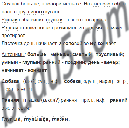 Слушай бол_ше, а г_в_ри мен_ше. На смел_ с_бака лает, а труслив_ кусает. Умн_ себя винит, глуп_ – своего товарища. Ранн_ пташка н_сок проч_щ_ет, а поз_н_ – гла_ки пр_тирает. Ласто_ка день начинает, а с_л_вей веч_р к_н_ает.