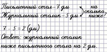 6. Высота письменного стола 7 дм, а высота жур­нального столика 5 дм. На сколько дециметров журнальный столик ниже письменного стола?