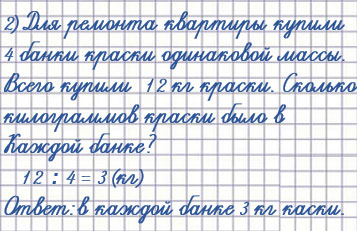 5. Для ремонта квартиры купили 4 банки краски, по 3 кг каждая. Сколько килограммов краски купили?