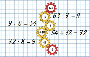 | 7 + 2 • (9 - 4) = 17 1) 9 - 4 = 5 2) 2 • 5 = 10 3) 7 + 10 = 17 | (9 + 18) : 3 + 6 = 15 1) 9 + 18 = 27 2) 27 : 3 = 9 3) 9 + 6 = 15 |