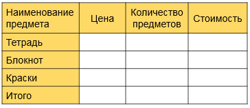 Данные о покупке запиши в таблице.