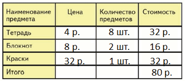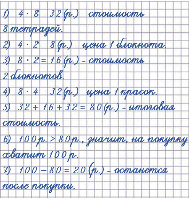 1) Посчитай, хватит ли 100 р., чтобы купить 8 таких тетрадей, 2 блокнота и 1 набор красок, если 1 тетрадь стоит 4 р.