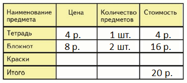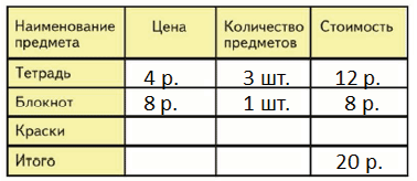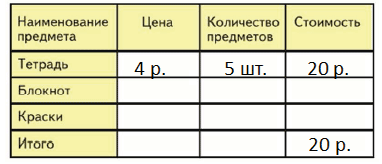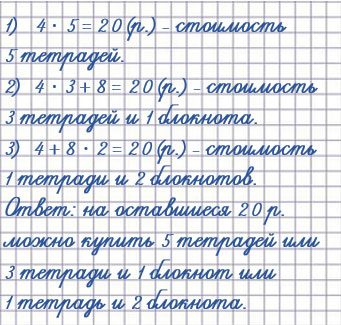 1 блокнот и 3 тетради: 8 + 4 • 3 = 20(р.)