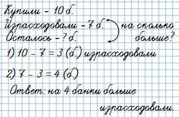 5. Для ремонта квартиры купили 10 банок краски, 7 банок израсходовали. Сколько банок с крас­кой осталось? На сколько больше банок краски израсходовали, чем осталось?