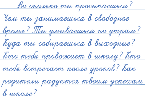 Во сколько ты просыпаешься? Чем ты занимаешься в свободное время? Ты умываешься по утрам? Куда ты собираешься в выходные? Кто тебя провожает в школу? Кто тебя встречает после уроков? Как роди-тели радуются твоим успехам в школе?