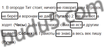1. В огороде Тит стоит, ничего не говорит, сам с грядок не берёт и воронам не даёт. (....) 2. Не шагают, а ходят. (....) 3. На сене лежит, сама не ест и другим не даёт. (....) 4. Грамоты не знаю, а весь век пишу. (....)