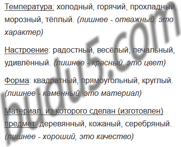 Игра «Кто самый внимательный?». Исправьте ошибки в распределении прилагательных по значению. Запишите группы слов, исключив лишние.