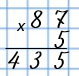 Умножаю единицы: 7 • 5 = 35. 35 ед. - это 3 дес. 5 ед.; 5 ед. пишу под единицами, а 3 дес. запоминаю и прибавляю их к десяткам после умножения десятков.
