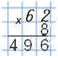 Умножаю десятки: 6 • 8 = 48. К 48 дес. прибавляю 1 дес., который получен при умножении единиц: 48 + 1 = 9. 41 дес. - это 4 сот. 9 дес.; 9 дес. пишу под десятками, а 4 сот. пишу в ответе в разряде сотен, так как других сотен для умножения нет.