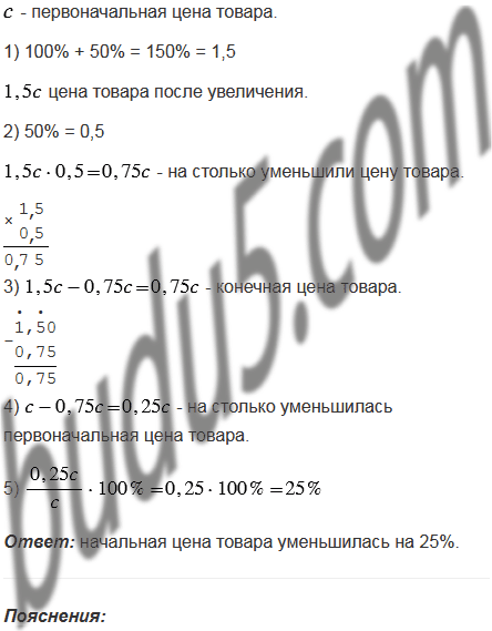 Цену товара сначала увеличили на 50%, а потом уменьшили на 50%. Увеличилась или уменьшилась и на сколько процентов начальная цена товара?