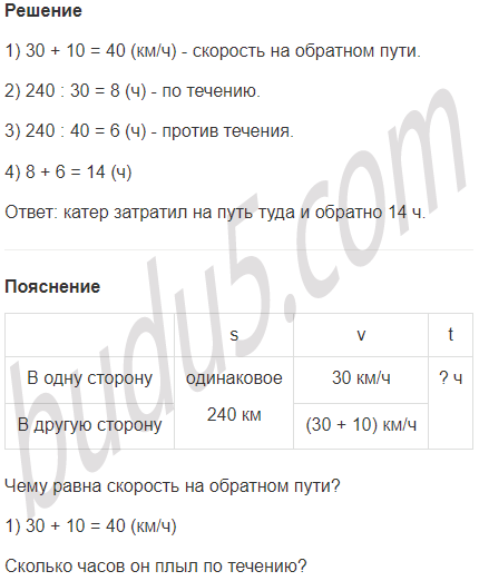 Задание № 4. Катер прошёл путь между двумя пристанями со скоростью 30 км/ч, а обратный путь - со скоростью на 10 км/ч большей. Расстояние между этими пристанями равно 240 км. Какое время затратил катер на путь туда и обратно?