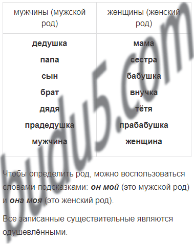 В русском языке имена существительные бывают мужского рода и женского рода. Догадался, в какой столбик ты записал слова мужского рода, а в какой – женского? Как ты это определил? Какими словами-подсказками можно воспользоваться? Какие существительные ты написал – одушевлённые или неодушевлённые?